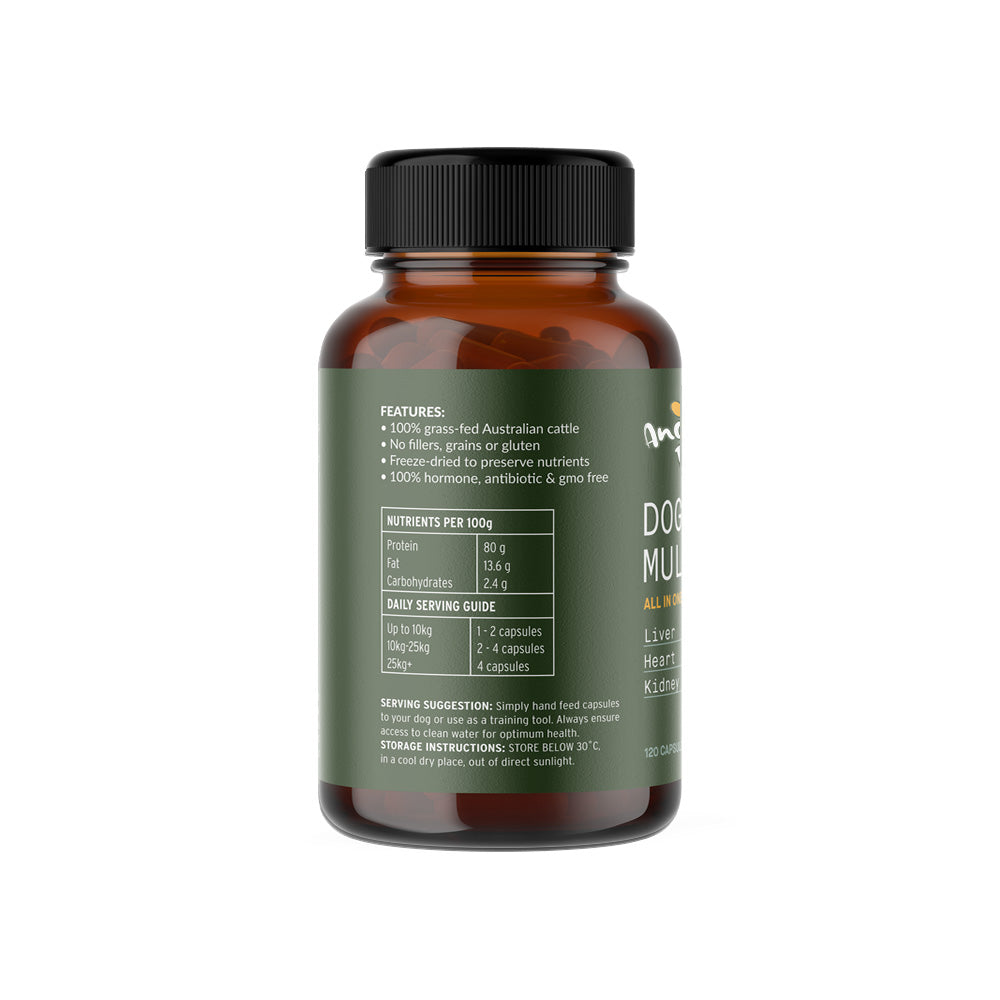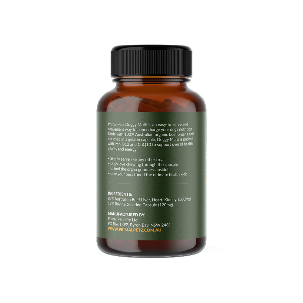 Doggy Multi is a natural supplement made from a blend of beef liver, heart, and kidney. Each capsule is chewable and tasty, making it easy for dogs to enjoy as part of their daily routine.